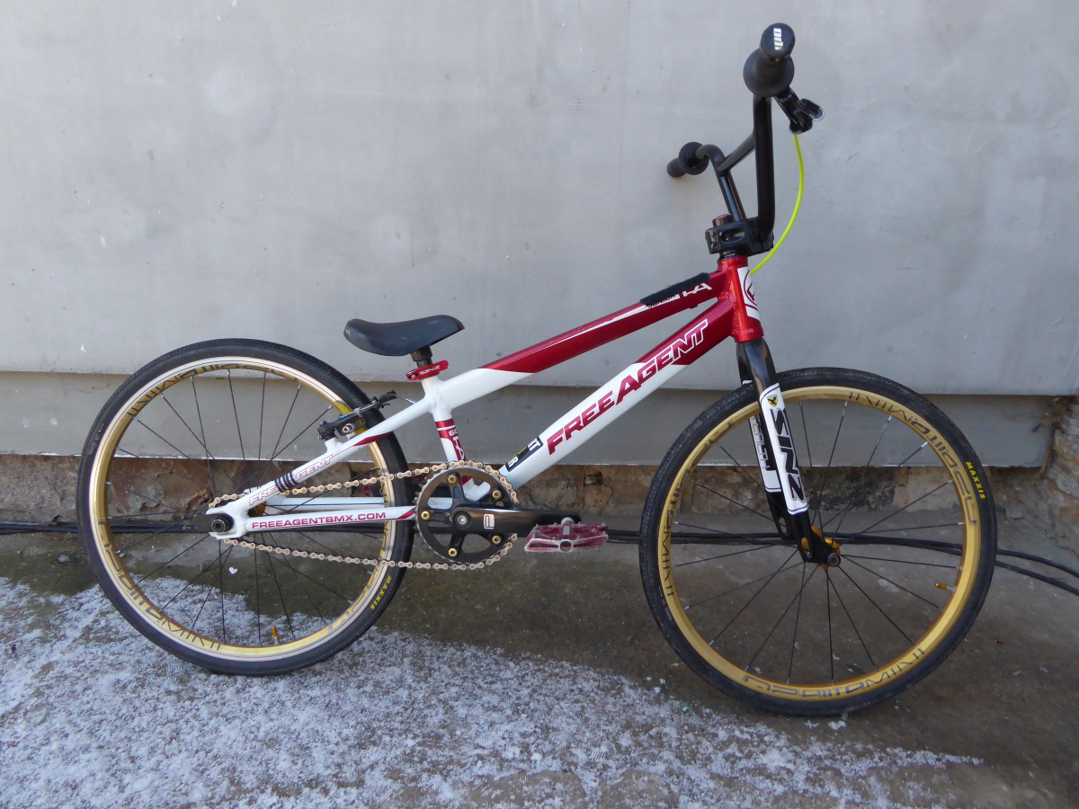závodní bikrosové kolo FREE AGENT. Velikost JUNIOR, karbonová vidlice SINZ, Pro závody: Kliky PROMAX 140mm, převodník GEBHARDT 37z, Al řídítka 6“, gripy ODI 105mm.